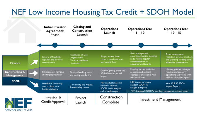 National Equity Fund serves as an experienced intermediary by connecting healthy housing investment opportunities using a Social Determinants of Health (SDoH) investment model for healthcare partners. NEF's team of housing experts has assembled new innovative partnership structures that connect healthcare partners with housing partners in the communities they serve and markets where they want to grow. Housing is a key component of stabilizing at-risk communities around the country, and our team is ready to help our healthcare partners lead with new, innovative investment solutions.